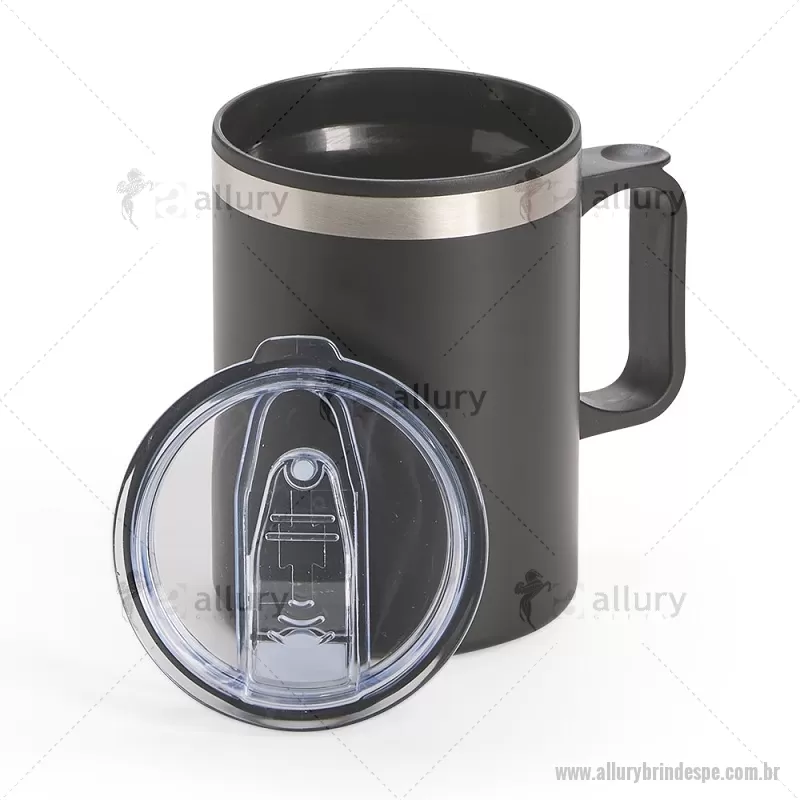 Caneca de 375 ml com interior plástico e revestimento externo em inox, que evita o aquecimento das mãos. Possui tampa com bocal e trava de segurança, além de base emborrachada antiderrapante. Prática e ideal para o dia a dia. - - ALLPECAN098
