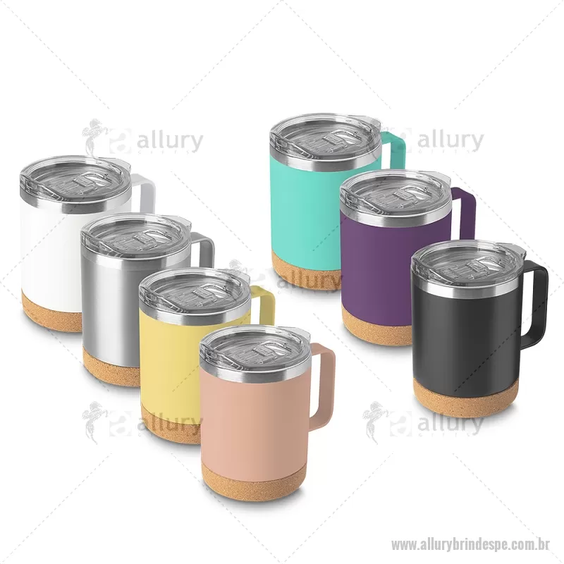 Caneca térmica em aço inox com parede dupla isolada à vácuo, tampa plástica e anel em silicone para vedação, alça lateral em inox na cor do produto, base em cortiça. Capacidade 350ml. - - ALLPECAN076
