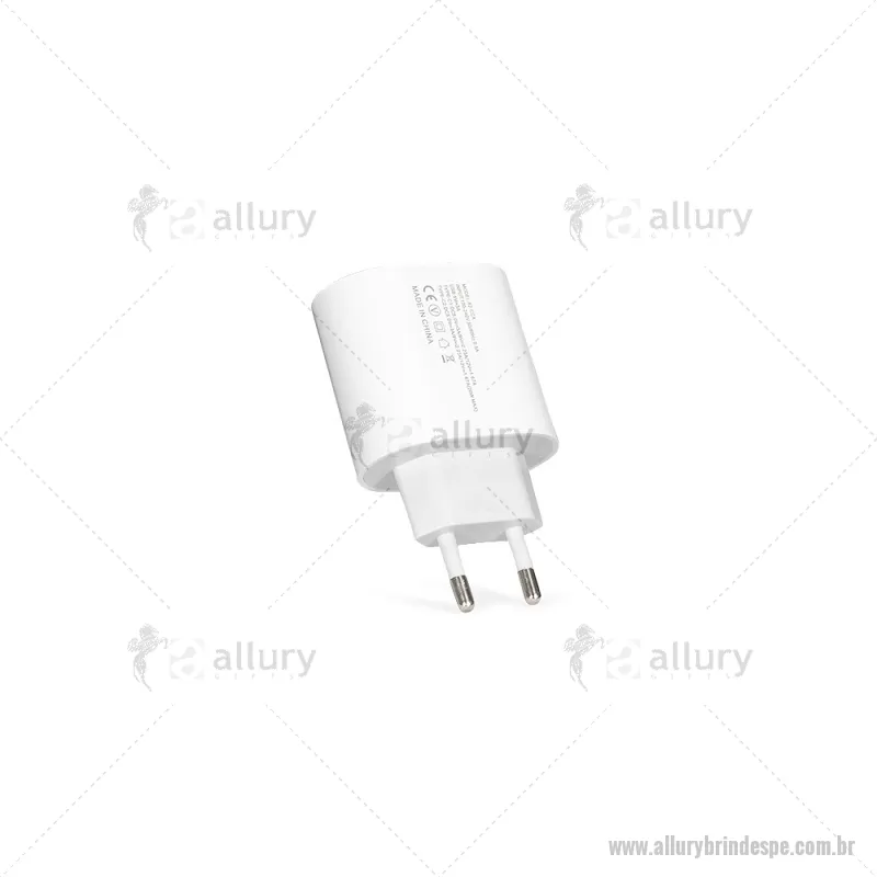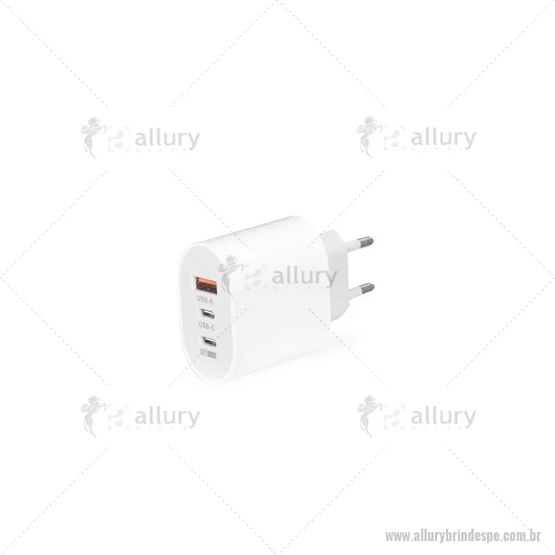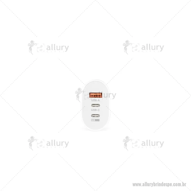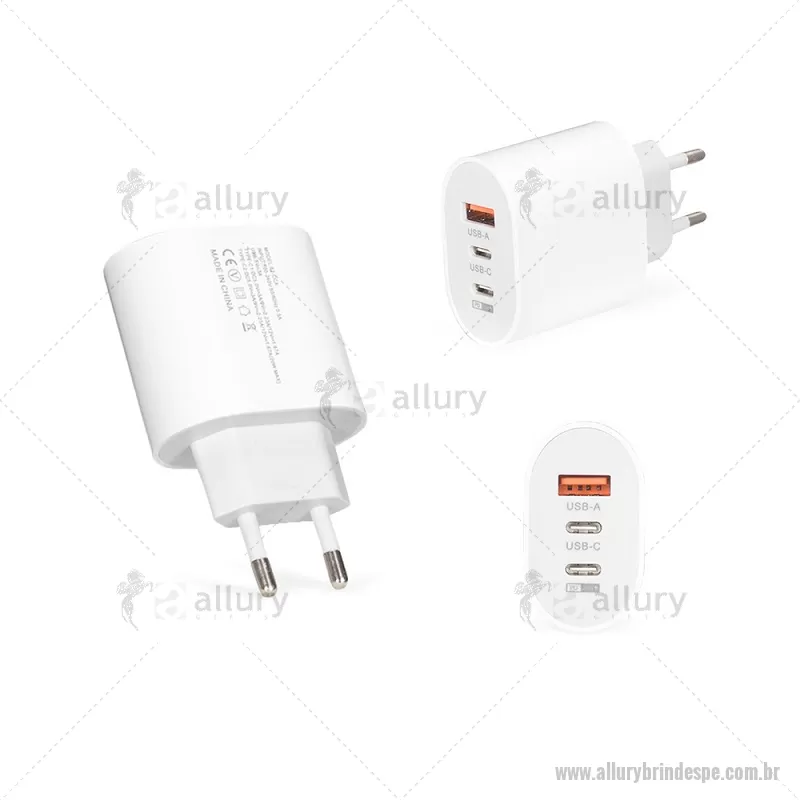 Carregador rápido em plástico leve e compacto, com três portas: uma USB-A e duas USB-C, incluindo uma opção de carregamento rápido de 20W. Ideal para recarregar diferentes dispositivos com praticidade. Cabo USB não incluído. - - ALLPETEC535