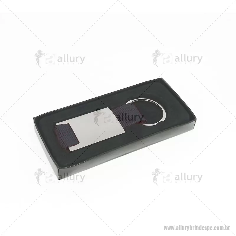Chaveiro de metal retangular com detalhes em nylon + caixa com berço aveludado. Obs.: Frente e versão são iguais. Dimensão Produto: 8,5x3,4cm (AxL) Peso do Chaveiro: 0,025kg Peso do berço aveludado: 9g - - ALLPECHV214