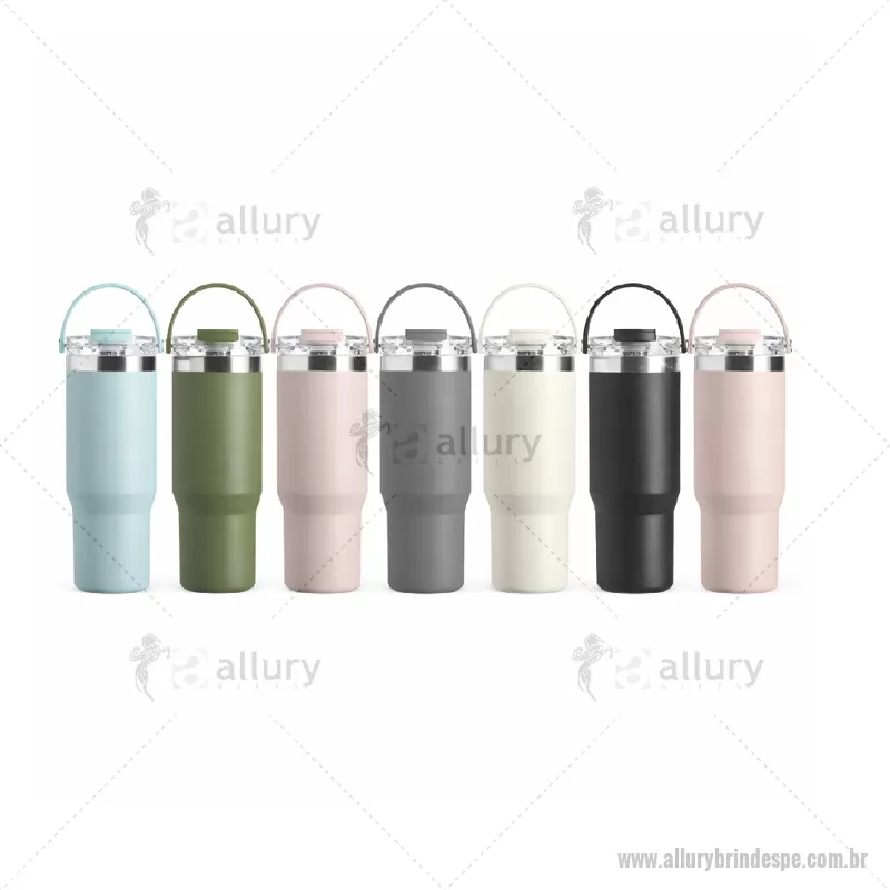 Copo térmico em aço inox com capacidade de 900ml, construído com parede dupla e isolamento a vácuo para melhor conservação térmica. Possui tampa plástica rosqueável com vedação, tampa protetora de bocal, bico flip e canudo interno removível. Inclui alça para transporte e acabamento em pintura eletrostática de alta resistência. - - ALLPECPO154