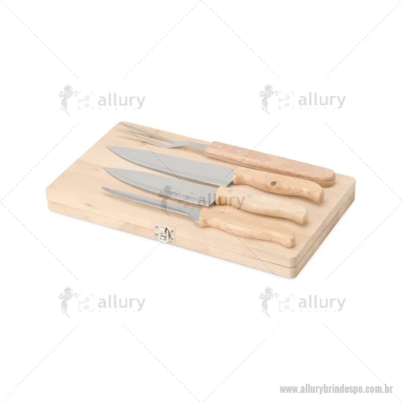 Kit Churrasco com 4 Peças e Estojo de madeira. Brinde ideal para quem curte passar o fim de semana cercado da família e amigos. Kit churrasco 4 peças em estojo de madeira. Contém três facas e um garfo. Altura : 3 cm x Largura : 35,4 cm x Profundidade : 19,8 cm Peso aproximado (g): 1449 - - ALLPEKCH040