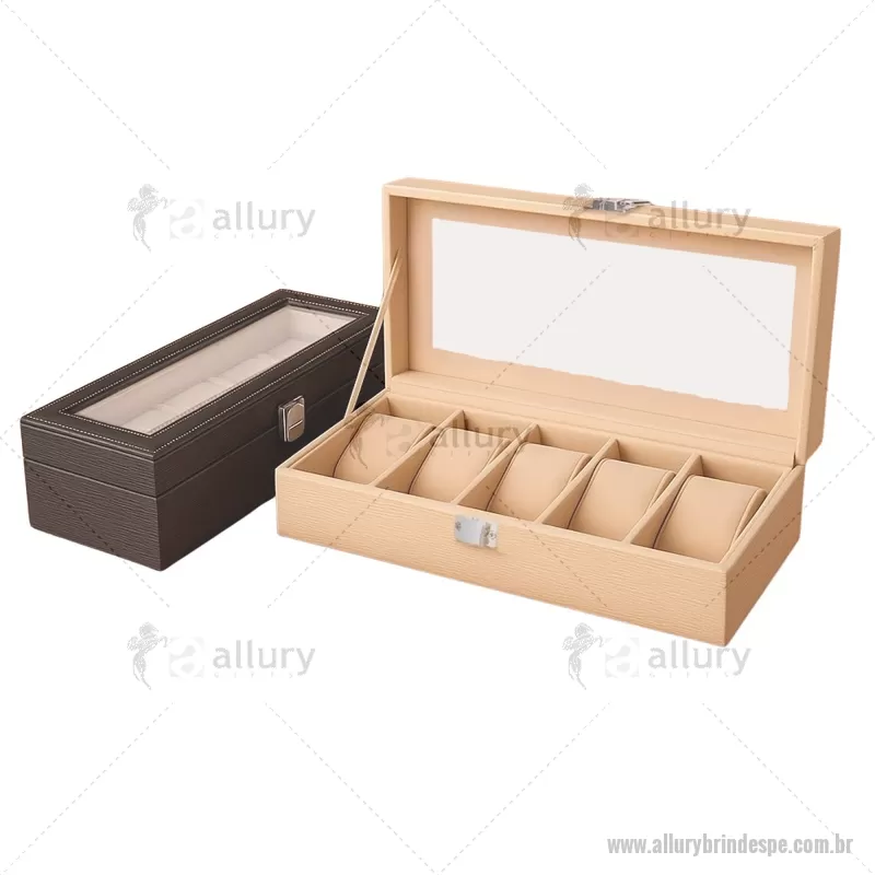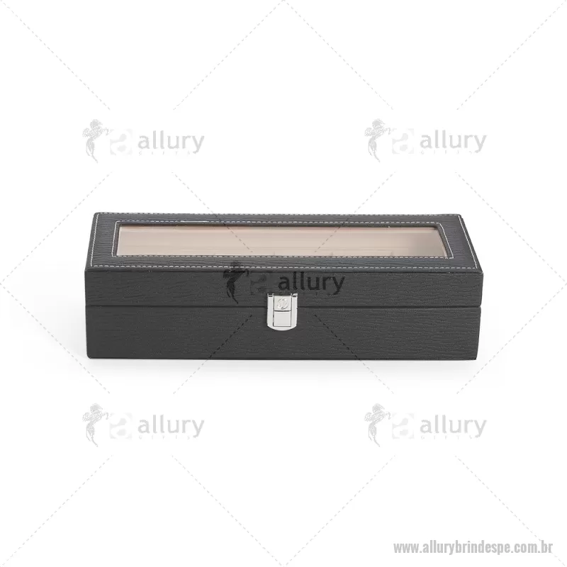 Porta-relógios com acabamento em couro sintético texturizado à base de PVC e interior revestido em tecido aveludado. Possui seis compartimentos com almofadas removíveis, visor em vidro transparente e trava de segurança, ideal para organizar e proteger relógios com elegância. - - ALLPEPREL004