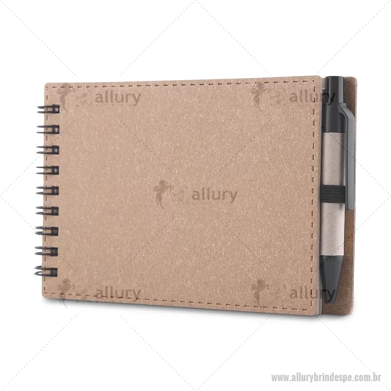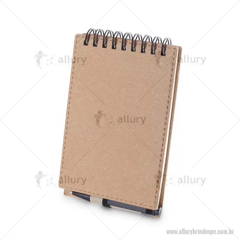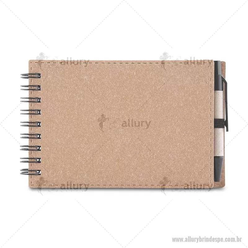 Mini Bloco/ Caderno A6 de anotações com caneta Mini Caderno com capa em papelão e encadernação espiral wire-o, 70 folhas sem pauta em 70g/m². Acompanha caneta confeccionada em papelão reciclado com detalhe em plástico. Dimensão Produto: 14x9cm (Caderno) Dimensão Produto: 8,3xø1cm (Caneta) Peso do Produto: 0,084kg - - ALLPEBLC277