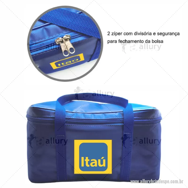 Bolsa Térmica Permeável com capacidade 10 litros Personalizada. * Contém 2 zíperes que assegura o completo fechamento da bolsa. * Material interno: PVC Sarja 0,15 Branco. * Consultar cores disponíveis. * Gravação em Silk Screen. Observação: A bolsa não é impermeável, portanto, não deve ser utilizada para carregar gelo e nem produtos congelados. Uma vez o alimento descongelando, a água irá vazar. Pode ser usada para levar mantimentos quentes e frescos. - - ALLPEBT004