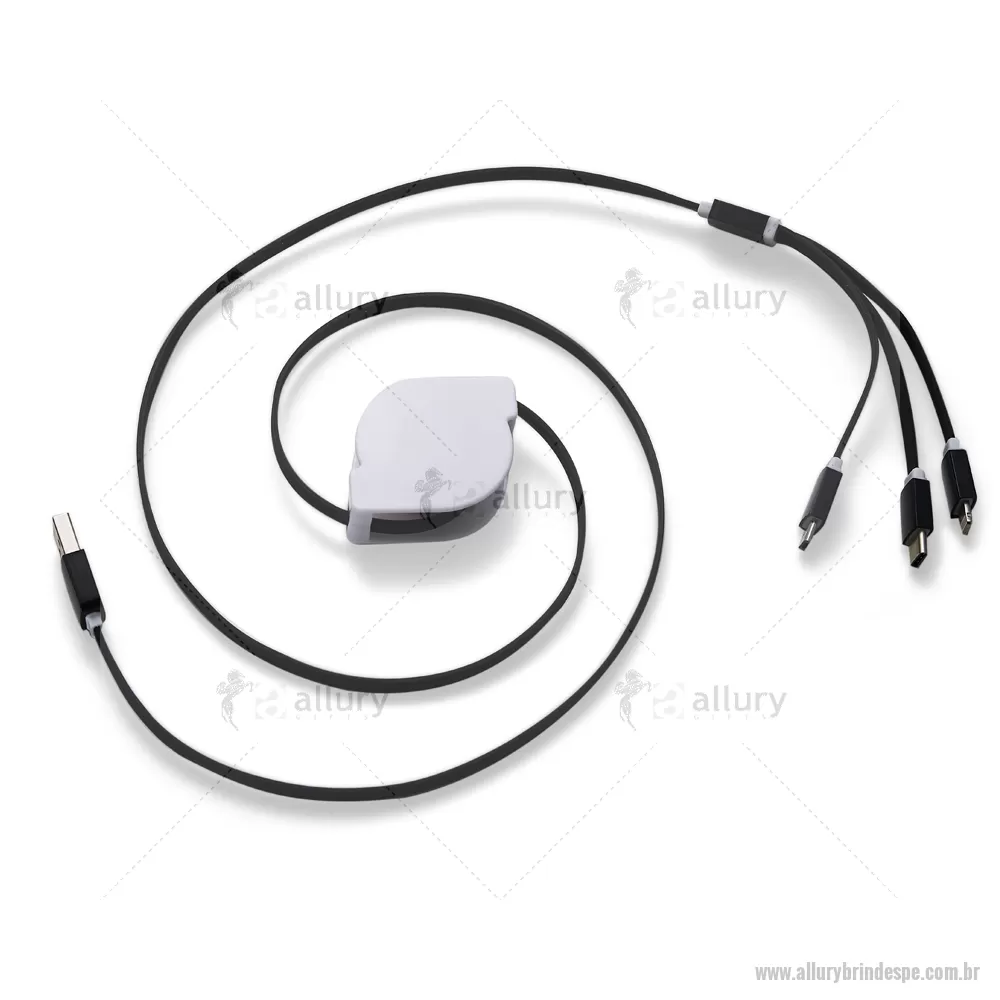 Cabo de dados retrátil 3 em 1 (não transfere arquivos). Entrada Lightning: Iphone, Ipad e Ipod; Entrada Micro USB: smartphones e tablets Android; Entrada Micro USB-C: modelos mais recentes de smartphones e tablets Android. Suporte plástico branco de frente lisa e verso com detalhe oval (com parafuso no centro). Possui rolamento com trava automática, os dois lados de cabo devem ser puxados simultaneamente e ao soltar irão travar. Não puxar um cabo por vez para não embolar. - - ALLPETEC281