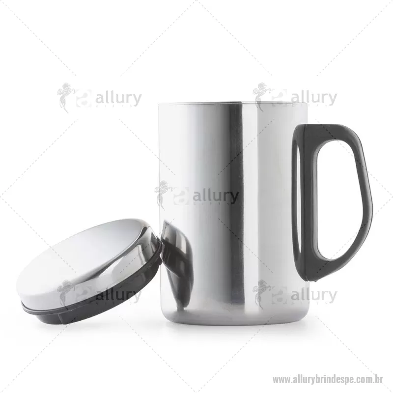 Caneca de 350ml inox com parede dupla, possui tampa com vedação e pegador plástico (não é térmica). - - ALLPECAN055