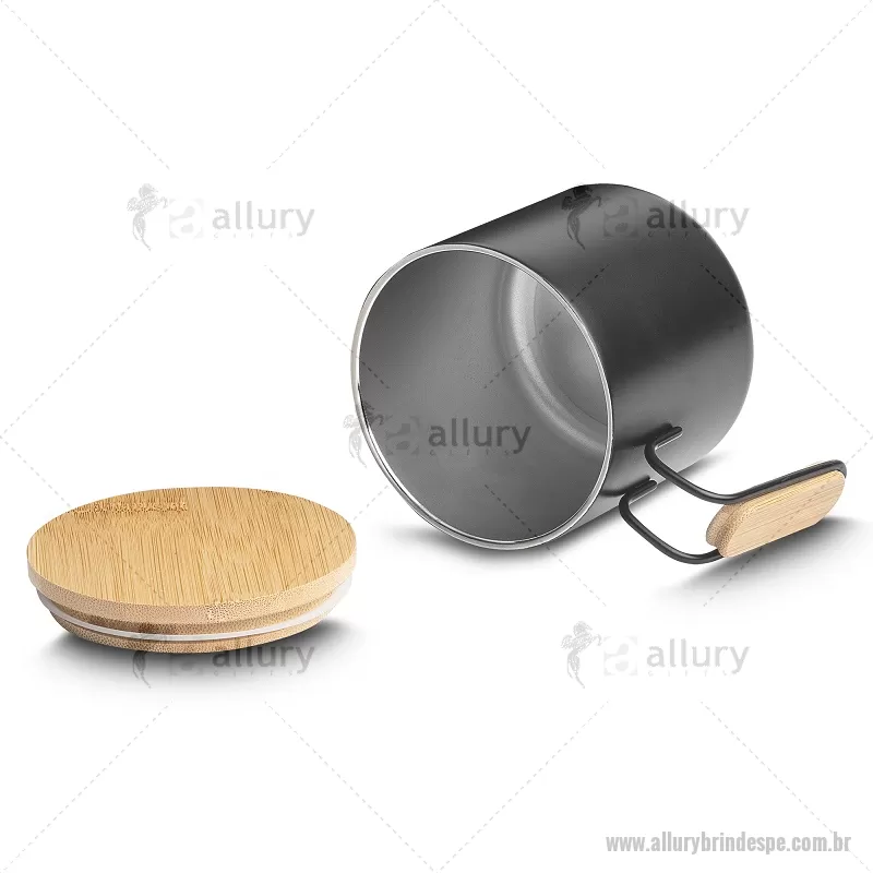 Caneca térmica em aço inox com parede dupla isolada à vácuo, tampa de bambu e anel em silicone para vedação, alça lateral com detalhe em bambu. Capacidade 380ml. - - ALLPECAN062