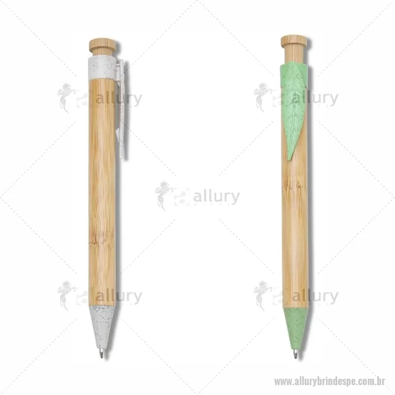 Caneta de bambu com detalhes plásticos e clip em formato de folha, aciona por clique. Ótimo brinde para ações promocionais e eventos corporativos. - - ALLPECPECO050