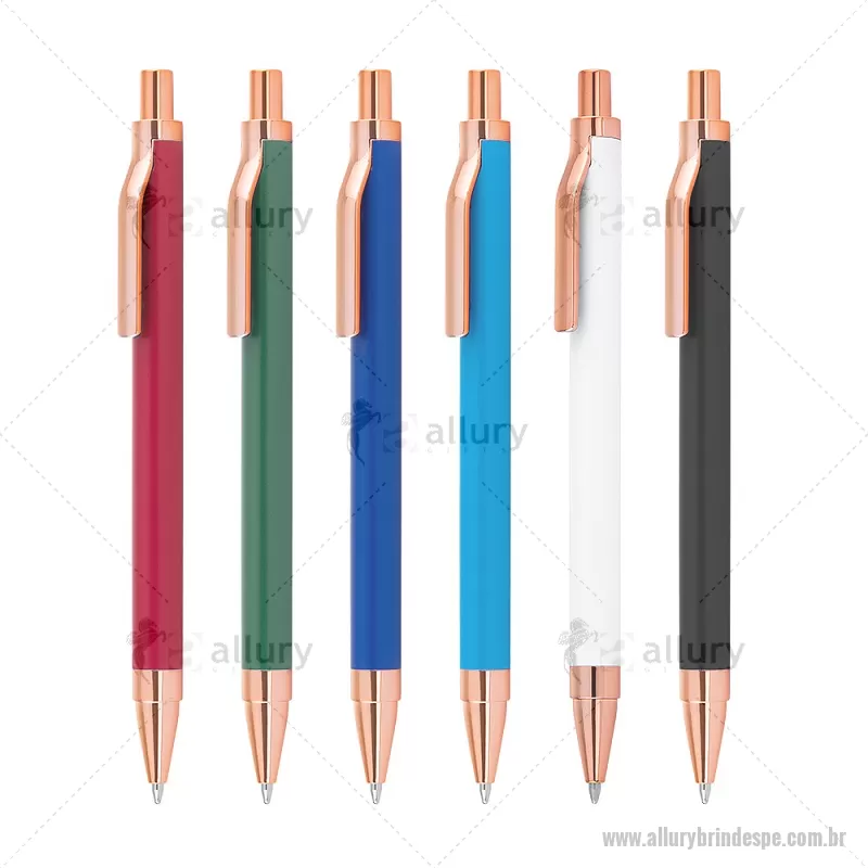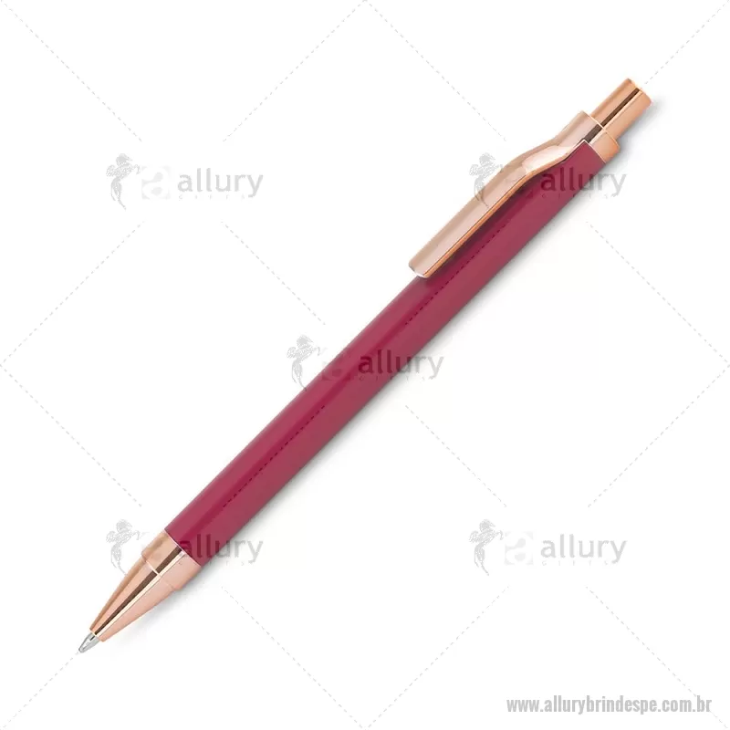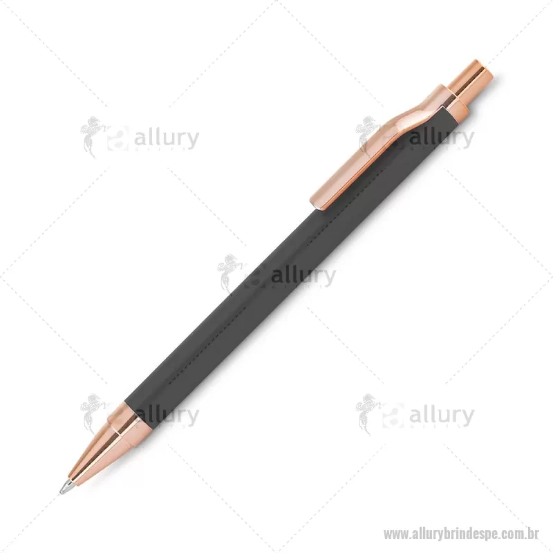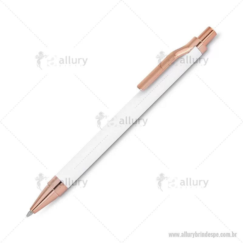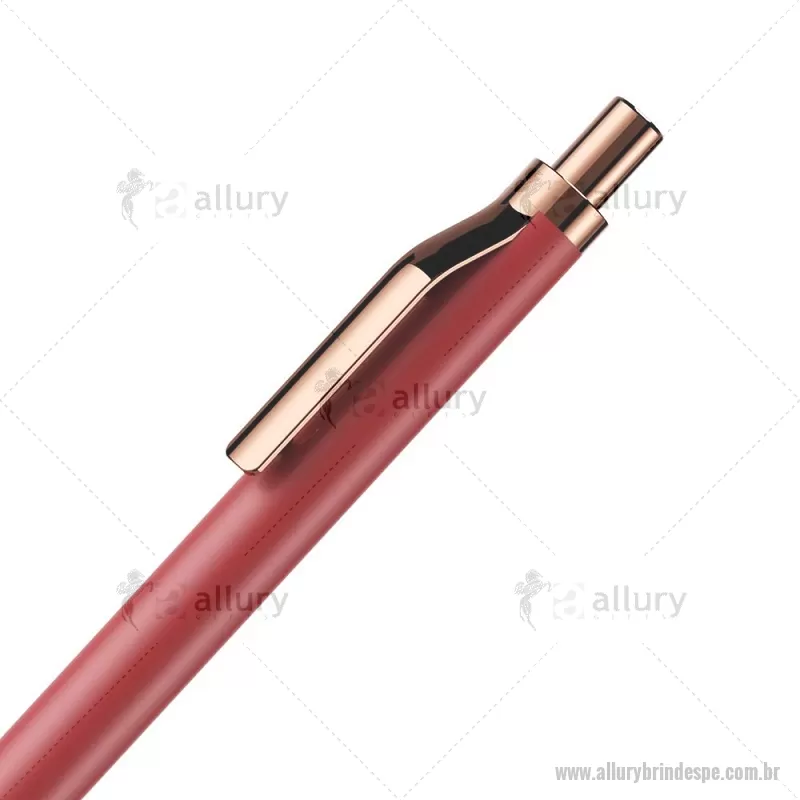 Caneta esferográfica com corpo em alumínio reciclado, acionador e clipe em acabamento rosé/bronze. Peso do Produto: 0,014kg Dimensão do Produto: 13,8xø1cm - - ALLPECMT307