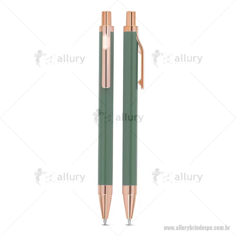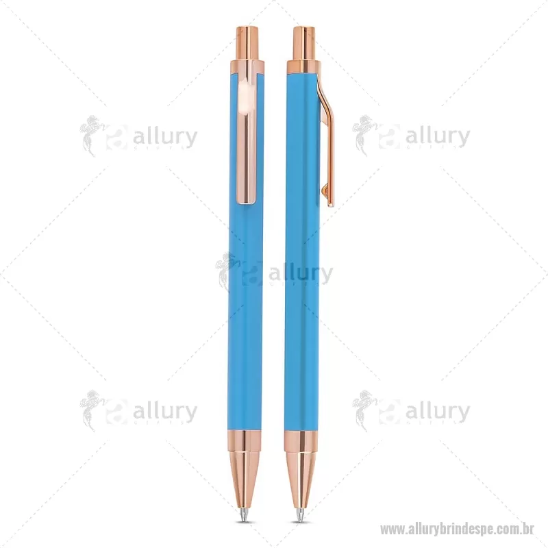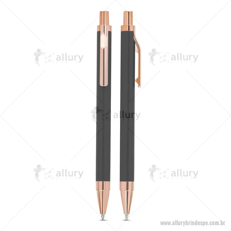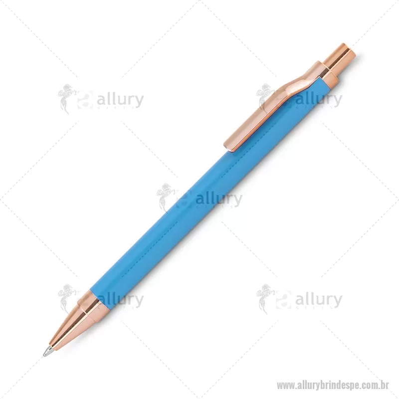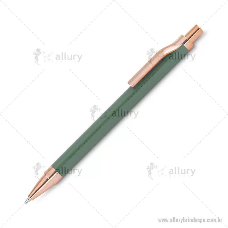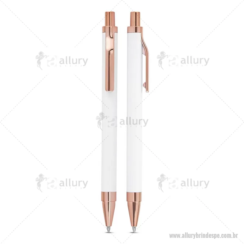Caneta esferográfica com corpo em alumínio reciclado, acionador e clipe em acabamento rosé/bronze. Peso do Produto: 0,014kg Dimensão do Produto: 13,8xø1cm - - ALLPECMT307
