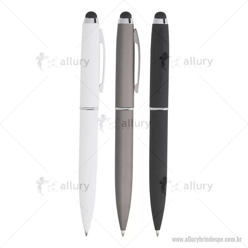 Caneta metálica touchscreen com acabamento emborrachado, acionamento por rotação e carga esferográfica azul 1mm. Largura : 1,7 cm x Comprimento : 14,4 cm Peso aproximado (g): 27 - - ALLPECMT272
