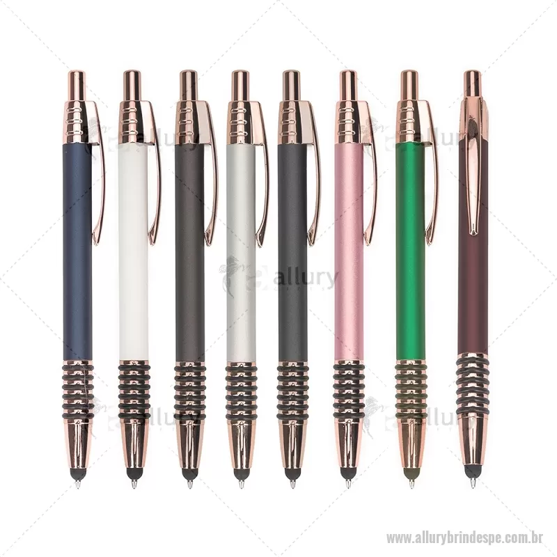 Caneta metálica com detalhes emborrachados no corpo, garantindo maior conforto na escrita. Possui carga esferográfica azul 1,0 mm, acionamento por clique e ponteira touch para uso em telas sensíveis ao toque. Prática e versátil para o dia a dia. - - ALLPECMT298