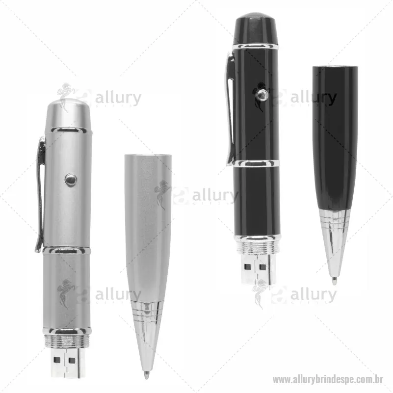 Caneta pen drive metálica com laser e esferográfica. Capacidade 4 GB. Clip de metal e botão do laser com lacre, ao desrosquear anel abaixo do clip. Abre compartimento das baterias(acompanha 3 LR1130) e ao desrosquear o anel abaixo abre compartimento do pen drive. Para utilizar a esferográfica basta rotacionar a ponteira. Brinde ideal para eventos corporativos. - - ALLPEPEN102-4GB