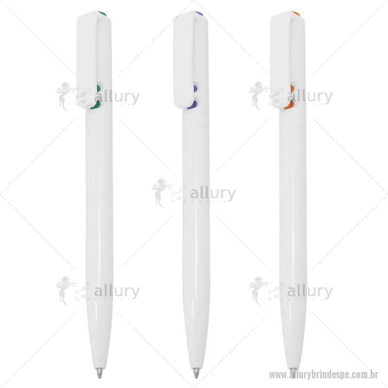 Caneta produzida em material plástico, possui acionamento por click, carga azul e clip lateral. Disponível em três combinações de cores: branca com verde, branca com roxo e branca com laranja. Gravação em Silk Screen. - - ALLPECPL137