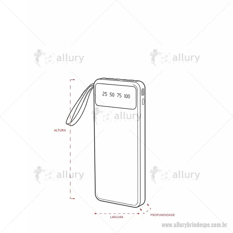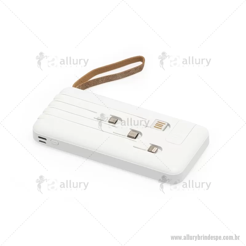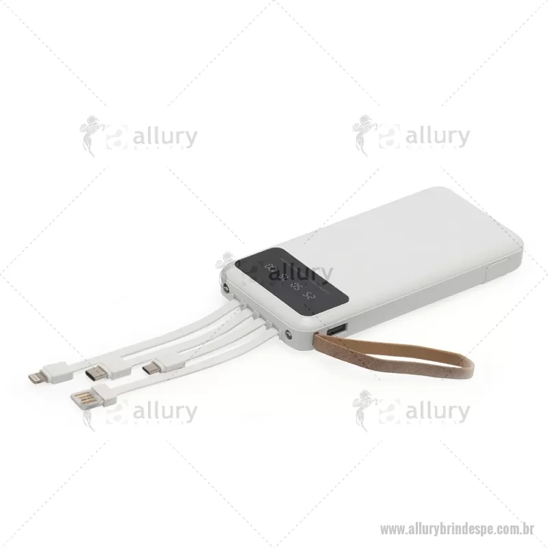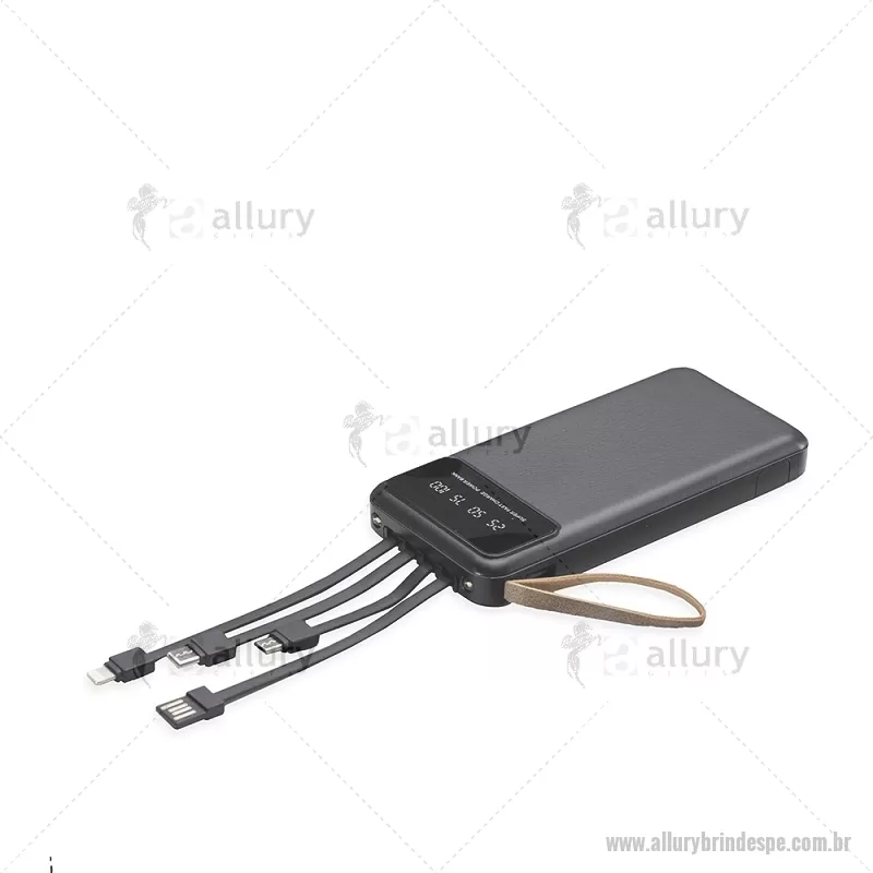 Power Bank 10.000mAh com Lanterna e Multissaídas Descrição: Carregador power bank de 10.000mAh com lanternas, múltiplas saídas e suporte para celular. Fabricado em plástico com display integrado, este power bank vem equipado com quatro cabos de carregamento, eliminando a necessidade de transportar cabos extras. Compatível com entradas V8, Tipo-C, Lightning e USB, praticidade é o sinônimo deste carregador. Com alça de couro sintético e um suporte funcional para celular, estilo gaveta, o power bank possui capacidade real de 6.000mAh para manter os dispositivos sempre carregados. Acompanha cabo USB-V8. medidas: Altura : 14,4 cm x Largura : 6,8 cm x Espessura : 2 cm Peso aproximado (g): 251 - - ALLPETEC550