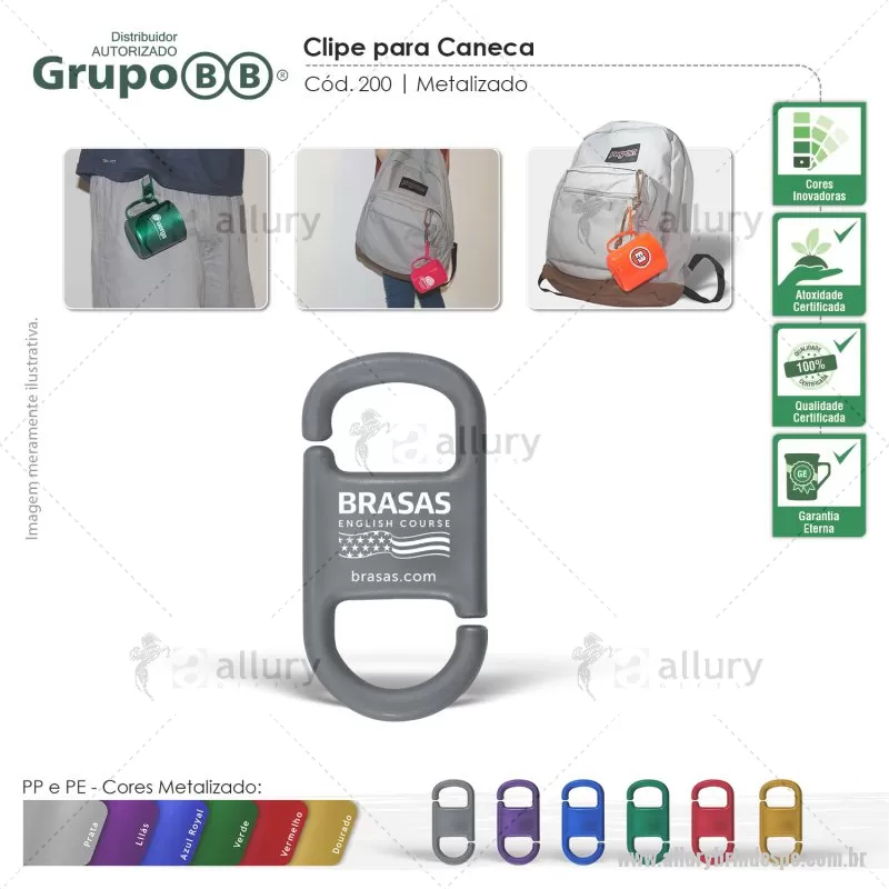 Clipe para caneca encaixável personalizado, fabricado em PP com alta resistência. Ideal para fixar em mochilas, cintura, para uso em eventos corporativos, ações promocionais, escolas, passeios e viagens. Cores Disponíveis - Linha Sólida: amarelo, branco, alaranjado, preto / Neon: Rosa, amarelo, verde, laranja / Metalizado: Azul, verde, vermelho, lilás, prata. Personalização 1 cor. Outras opções sob consulta. Distribuidor Autorizado Grupo BB. - - ALLPEZ200