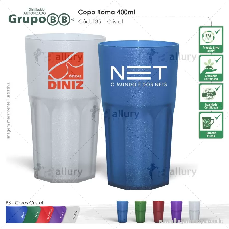 Capacidade para 400ml. Design moderno e acabamento impecável, o Copo Roma é feito em plástico PS Cristal atóxico. A transparência deixa o produto mais moderno e elegante. Parede espessa resultando em um produto robusto de alta qualidade. Cores Disponíveis - CRISTAL: Transparente, verde, vermelho, azul, lilás / NEON CRISTAL: rosa neon, verde neon, amarelo neon, alaranjado neon. Brinde ideal para ações de promocionais e eventos corporativos. Personalização 1 cor. Outras opções sob consulta. Distribuidor Autorizado Grupo BB. - - ALLPEZ135
