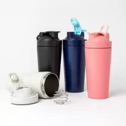Coqueteleira/Garrafa Plástica Personalizada 720 ml com Copo. Plástico Utilizado: PP (Polipropileno). Compartimento com divisória para comprimidos, armazenar shake/suplemento em pó, sendo todos estes rosqueáveis e possível de guardar dentro do próprio copo,acompanha peneira, tampa de rosca e trava na própria tampa para beber. - - ALLPECOQ009