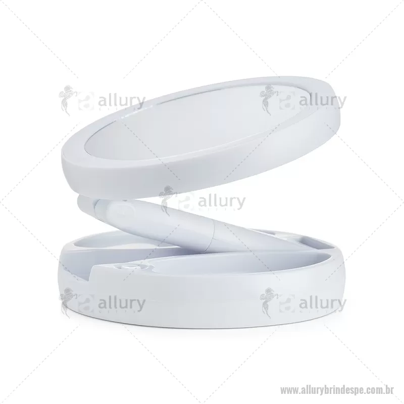 Espelho Dobrável com LED Recarregável e dupla face, material plástico. O espelho possui uma das faces ampliada 10x e do outro lado, espelho convencional 1x, iluminação LED dos dois lados, três compartimentos na base para armazenamento de acessórios, espelho giratório e regulável, botão liga/desliga e botão para acionar a iluminação, com funcionamento à base de 4 pilhas AA ou via cabo USB. Acompanha antiderrapantes emborrachados. - - ALLPEFEM099