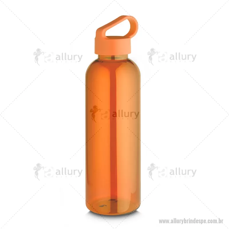 Garrafa *RPET com capacidade de até 550ml, tampa plástica com alça integrada.