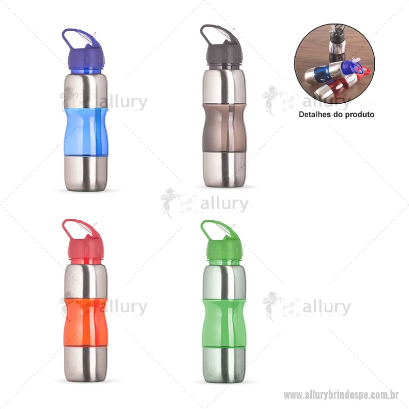 Squeeze de alumínio personalizado 600ml com alça plástica e bico de canudo. Possui detalhes plástico coloridos, tampa rosqueável com bico e canudo interno. Tamanho total aproximado (CxD): 25 cm x 7 cm x 21,8 cm - - ALLPESQM003