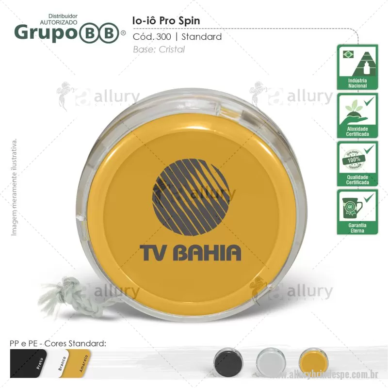 Io-iô PRÓ SPIN personalizado de alta performance base Maciça fixada por ultrassom em PS cristal com laterais acopladas em PP. Cordão duplo em algodão trançado. CORDÃO - NATURAL (CRU) / PARTE INTERNA - CRISTAL: Transparente, verde, vermelho, azul, lilás / NEON CRISTAL: rosa neon, verde neon, amarelo neon, alaranjado neon. PARTE EXTERNA - Linha Sólida: amarelo, branco, alaranjado, preto / Neon: Rosa, amarelo, verde, laranja / Metalizado: Azul, verde, vermelho, lilás, prata. Ótimo brinde para ações promocionais. Personalização 1 cor. Outras opções sob consulta. Distribuidor Autorizado Grupo BB. - - ALLPEZ300