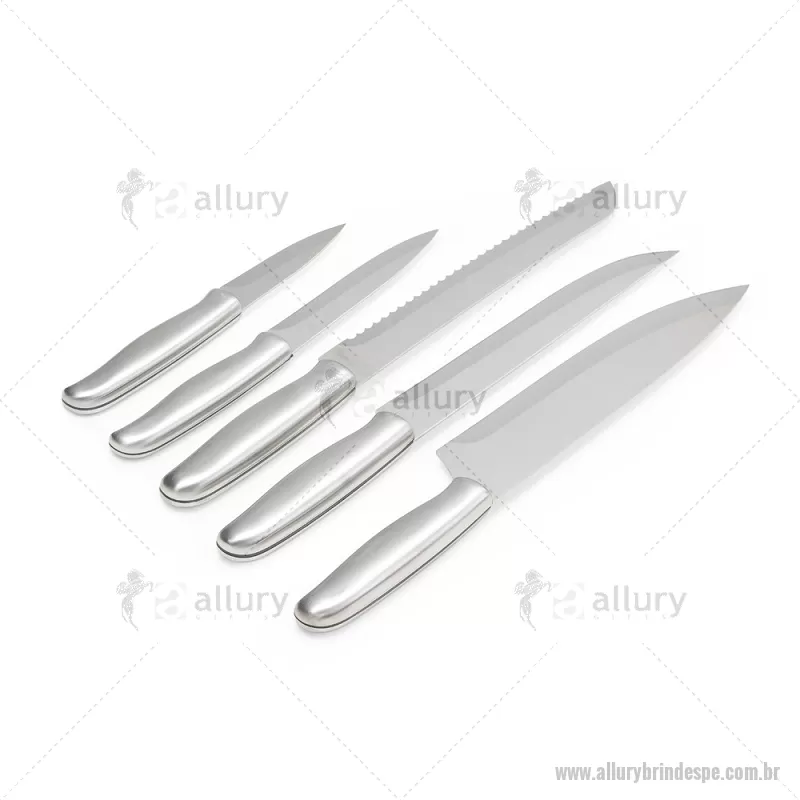 Kit Facas 5 Peças A solução ideal para quem valoriza qualidade nos cortes e organização na cozinha. O kit inclui 5 facas em aço inoxidável, com diferentes tamanhos, perfeitas para uma experiência gourmet. Acompanha uma maleta de alumínio texturizado, com interior revestido de veludo e duas travas que garantem maior segurança. Além disso, a maleta oferece espaço para personalização, tornando o kit ainda mais exclusivo. Largura : 26,2 cm x Profundidade : 3,2 cm x Comprimento : 35,9 cm Peso aproximado (g): 1161 Características Técnicas Medidas Faca Pequena (A x L x E): 19 cm x 2,3 cm x 1,8 cm Medidas Faca Média (A x L x E): 22,4 cm x 2,3 cm x 1,8 cm Medidas Faca de Pão (A x L x E): 31,5 cm x 2,7 cm x 2,4 cm Medidas Faca de Carne (A x L x E): 31 cm x 2,7 cm x 2,7 cm Medidas Faca Chefe (A x L x E): 31,5 cm x 4,2 cm x 2,4 cm - - ALLPEKCH084