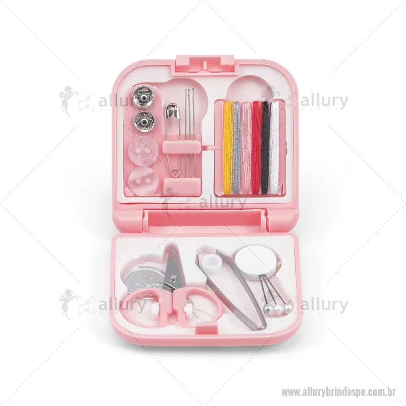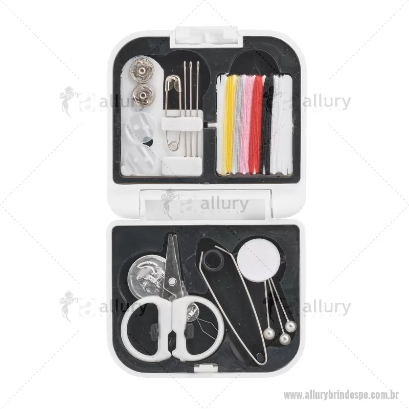 Kit de costura prático e leve para viagem Conjunto de costura prático e leve para levar em viagem. Composto por 3 alfinetes, 3 agulhas, 1 pinça, 1 tesoura, 1 enfia linha, 1 alfinete, 2 botões, 2 colchetes e 6 rolos de linhas de várias cores. Fornecido em estojo. Medidas: 70 x 21 x 65 mm Peso do Produto (g.): 46 - - ALLPEFEM084