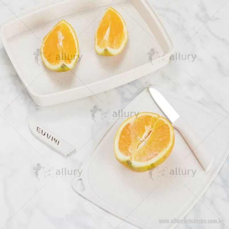 Kit Cozinha 3 Peças em plástico de palha de trigo e inox. Contém tesoura culinária, faca com protetor e descascador de legumes. Acompanha bandeja e tampa, podendo ser utilizada como recipiente e tábua para corte. - - ALLPECOZ027