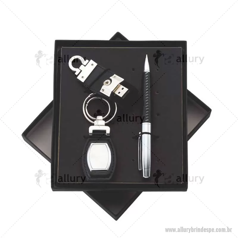 Conjunto executivo com pen drive, caneta e chaveiro. Material em couro e metal. Gravação a laser. - - ALLPECOJ002