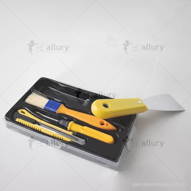 Kit ferramenta 4 peças em estojo plástico com trava de segurança. Contém chave dupla(Phillips e Fenda), estilete, pincel e espátula. - - ALLPEFER060