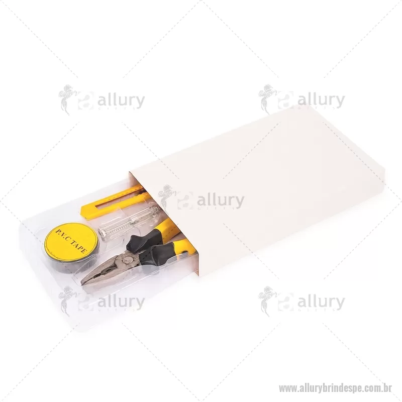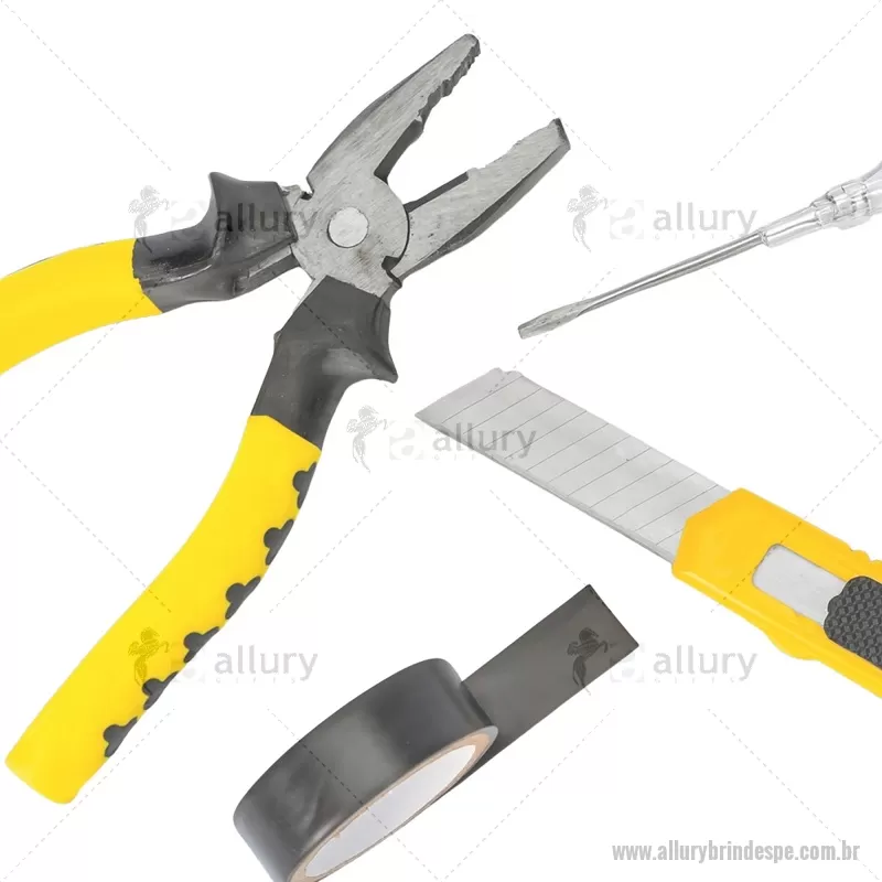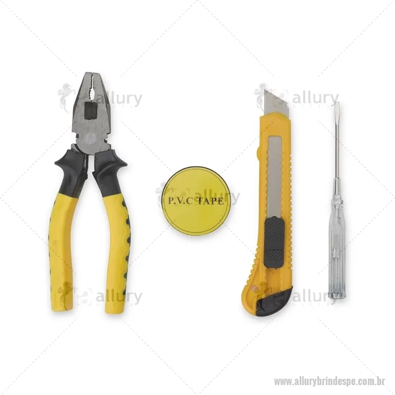 Kit de ferramentas compacto para uso diário, composto por chave de fenda teste, estilete, alicate e fita PVC. Todas as peças possuem acabamento em plástico resistente, oferecendo praticidade, conforto e durabilidade para pequenos reparos e imprevistos do dia a dia. - - ALLPEFER066