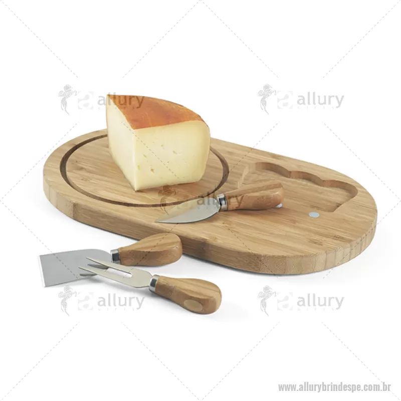 Kit queijo personalizável com 4 peças: Duas facas de queijo, uma p/ queijo parmesão, uma para queijo mais duros, um garfo para servir e uma base de madeira com local p/ acoplar os talheres após seu uso. Talheres em aço inox e cabo de madeira. Gravação em Laser. - - ALLPEKQJ011