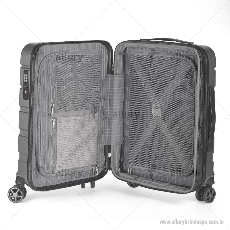 Mala de viagem em policarbonato. Abertura frontal com ziper para acesso ao interior da mala; Sistema de carrinho de aço; Alça de mão na lateral e na parte superior; Quatro rodas de 360 graus; Cadeado tipo TSA ; Saída USB. Expansor prático aumentando o espaço interno; - - ALLPEMC202