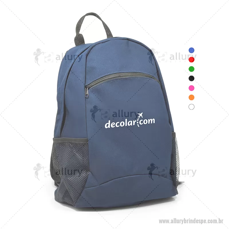 Mochila em Poliéster. Possui um bolso frontal e dois bolsos laterais em tela (ideal para carregar squeezes) e alça de mão. Suas alças ajustáveis são confortáveis. Gravação personalizada em Silk Screen. Ideal para brindes promocionais e ações de marketing. - - ALLPEMC015