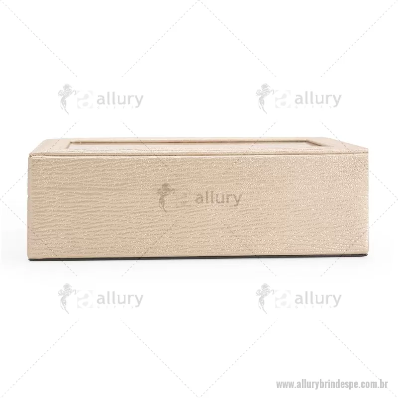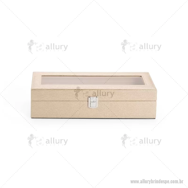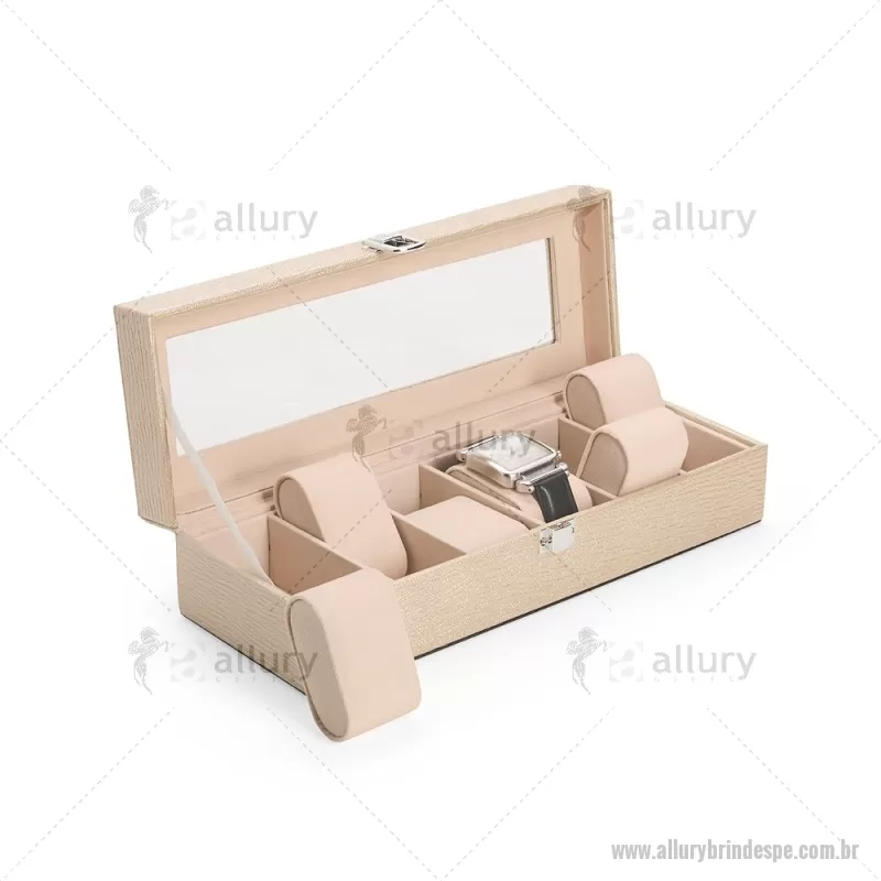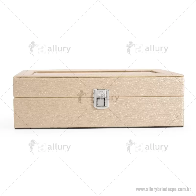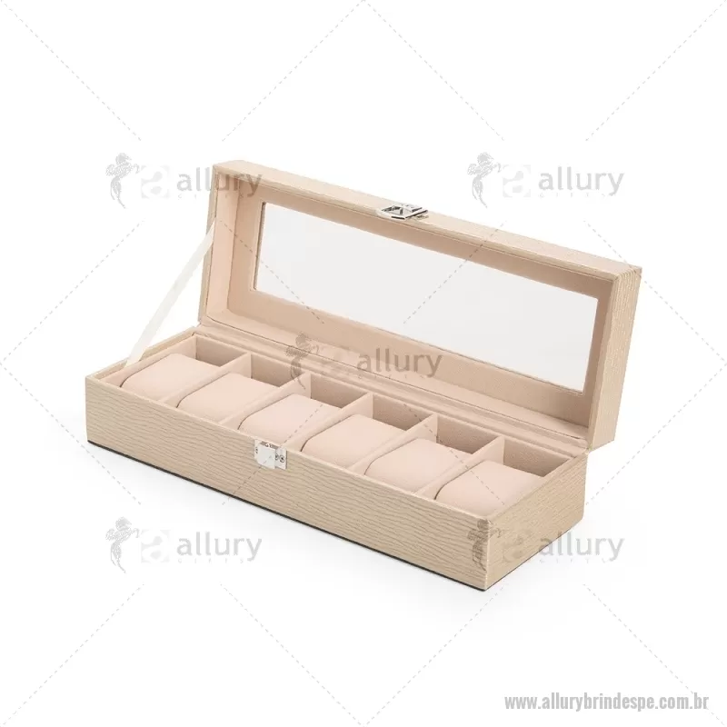 Porta-relógios com acabamento em couro sintético texturizado à base de PVC e interior revestido em tecido aveludado. Possui seis compartimentos com almofadas removíveis, visor em vidro transparente e trava de segurança, ideal para organizar e proteger relógios com elegância. - - ALLPEPREL004