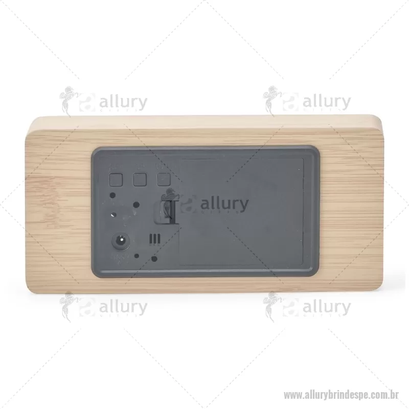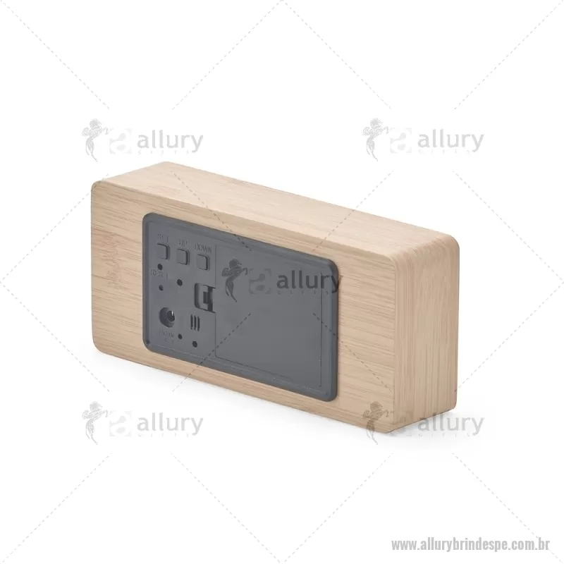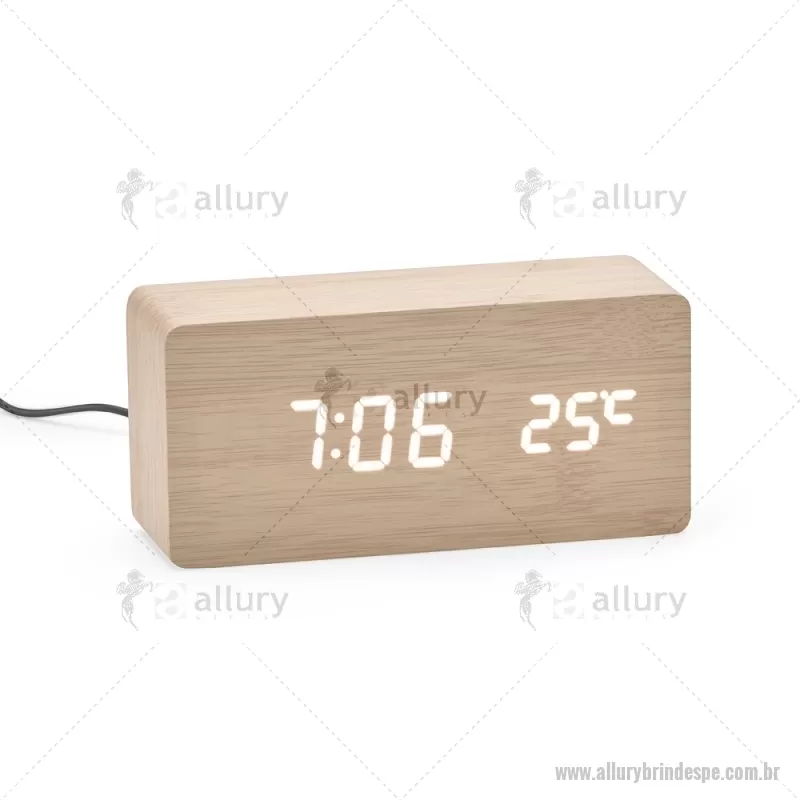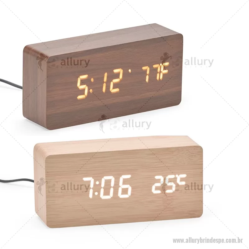 Relógio despertador em madeira com display LED, que combina design elegante e tecnologia moderna. Exibe horas, data e temperatura ambiente, além de permitir a programação de até três alarmes com diferentes configurações. Pode ser alimentado por 4 pilhas AAA (não inclusas) ou por cabo USB DC 5V, que acompanha o produto, oferecendo praticidade para o uso diário. - - ALLPEREL023