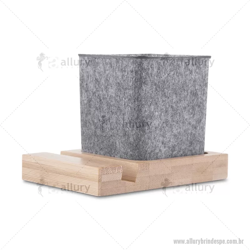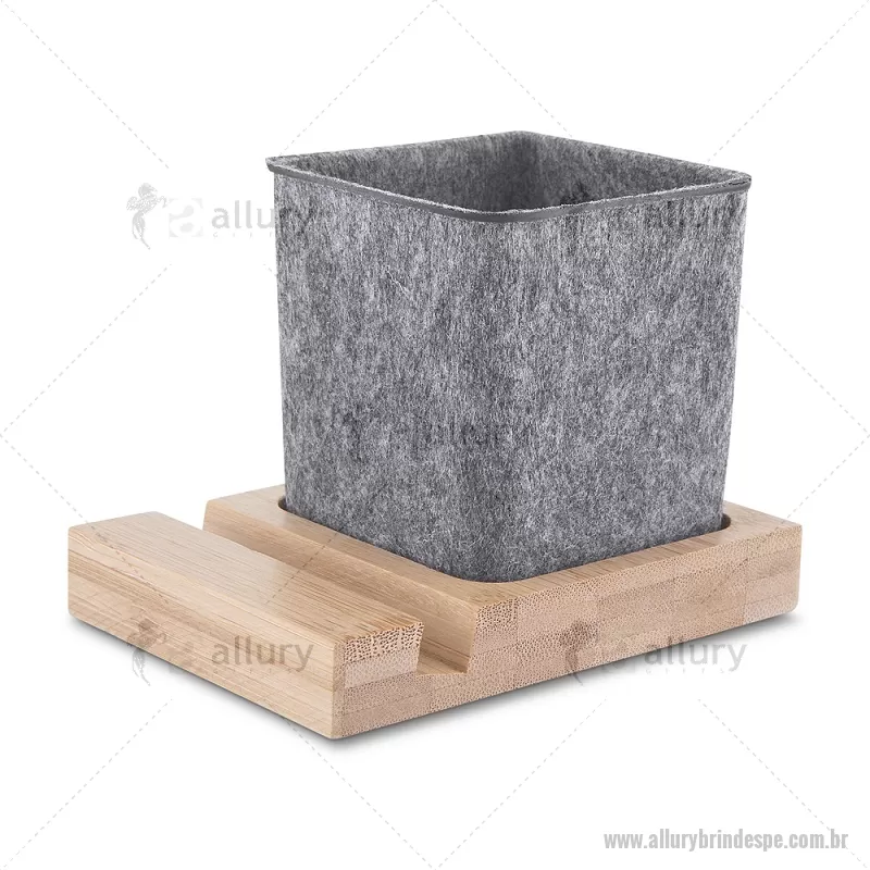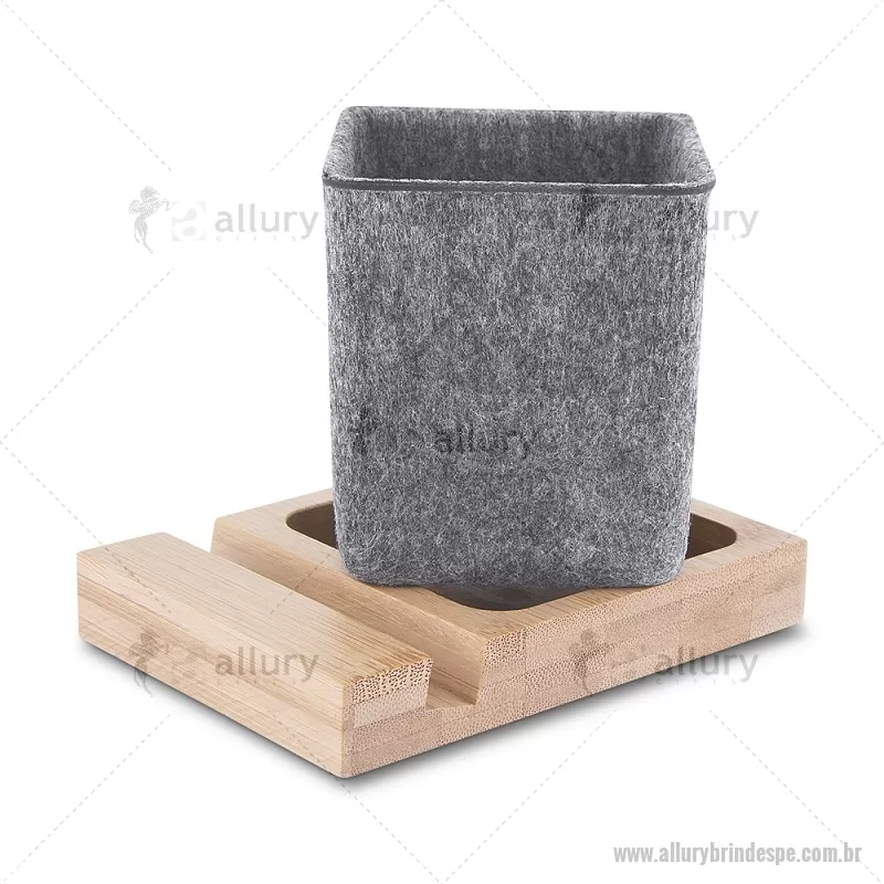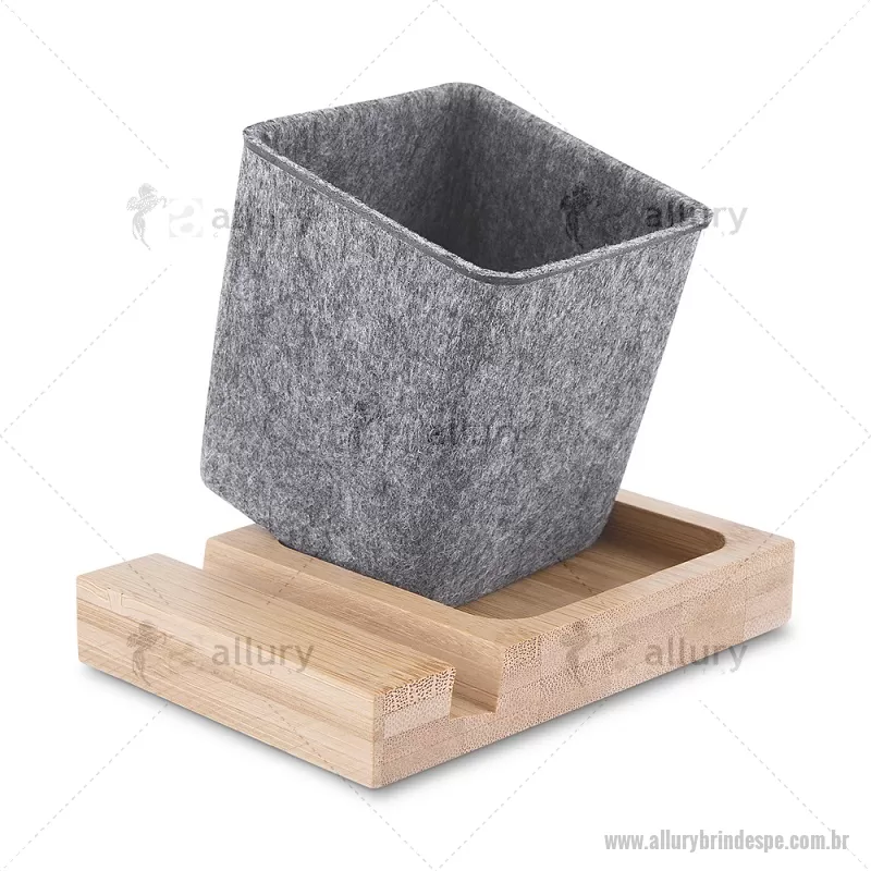 Porta objetos/smartphone em feltro e bambu Porta-objetos em feltro reciclado com suporte para celular em bambu. Prático e versátil, ideal para organizar canetas, lápis, marcadores e manter a mesa de escritório sempre funcional e elegante. Peso do Produto: 0,112kg Dimensão do Produto: (1,7x11,7x8,5cm) (Base em bambú) Dimensão do Produto: 8x6,5x6,5cm (Porta Caneta) - - ALLPEPC021